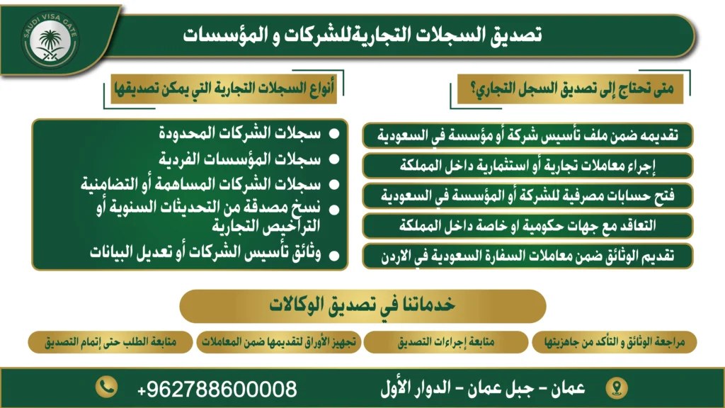 يُعد تصديق السجلات التجارية من الخطوات الأساسية لأي شركة أو مؤسسة ترغب في ممارسة أنشطتها الرسمية أو تقديم معاملاتها داخل المملكة العربية السعودية. فالسفارة السعودية في الأردن غالبًا ما تطلب نسخًا مصدّقة من السجلات التجارية لضمان الاعتراف القانوني بالشركة أو المؤسسة داخل المملكة.